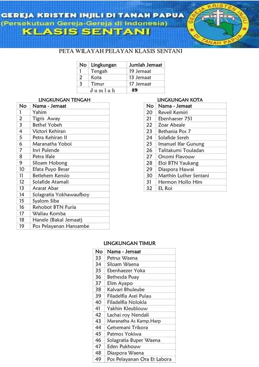 Klasis Sentani terdiri dari 45 jemaat yang diselenggarakan di tiga lingkungan. Klik pada link berikut untuk mempelajari lebih lanjut: Lingkungan Tengah Lingkungan Kota Lingkungan Timur